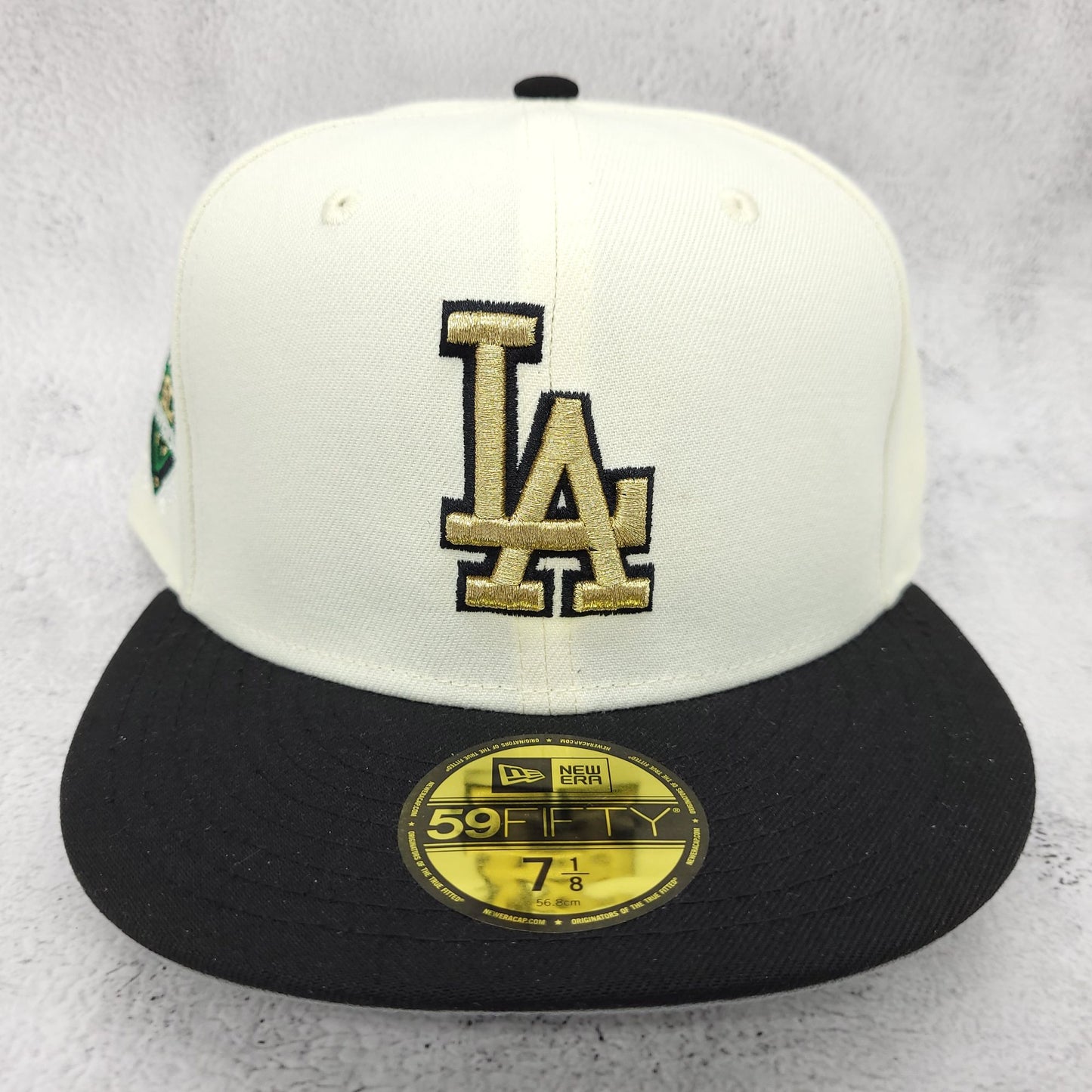 This Crown Minded Los Angeles Dodgers New Era 59FIFTY Fitted Cap labeled 'Rodeo Drive' stands out with a stunning gold & black LA logo and 50th Anniversary side patch. A super rare gem you won't see come around too often.