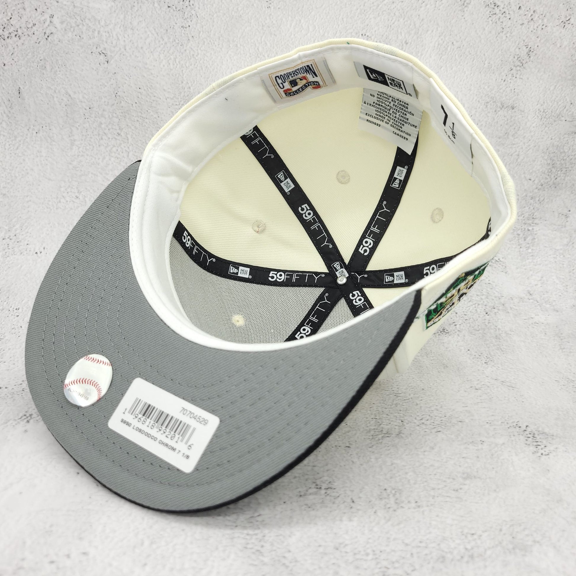 - Color: Off white / cream crown, black visor / brim, grey UV